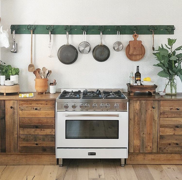 The rich and rustic texture of wood instantly adds a farmhouse feel to the kitchen. Eye-catching reclaimed wood creates a lived-in feeling for a more enticing and welcoming environment.