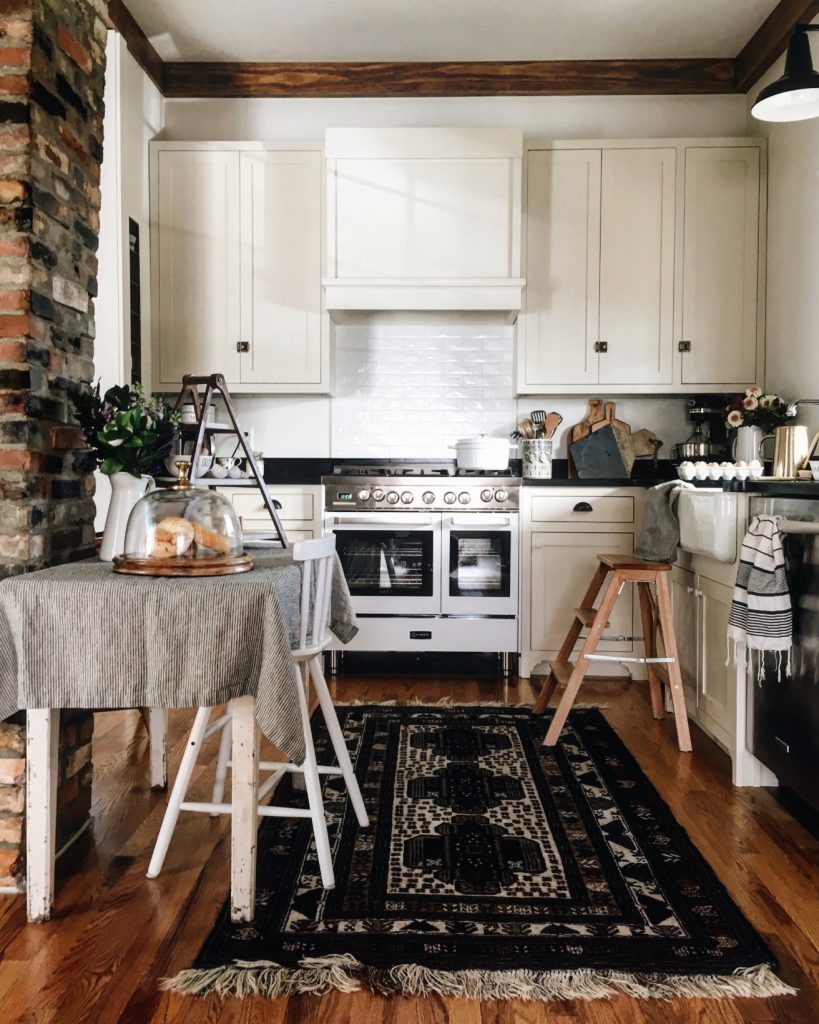 Subtle rustic touches add coziness to the heart of the home. Old family textiles or antique wooden stools add a little bit of history and charm to a modern farmhouse design.