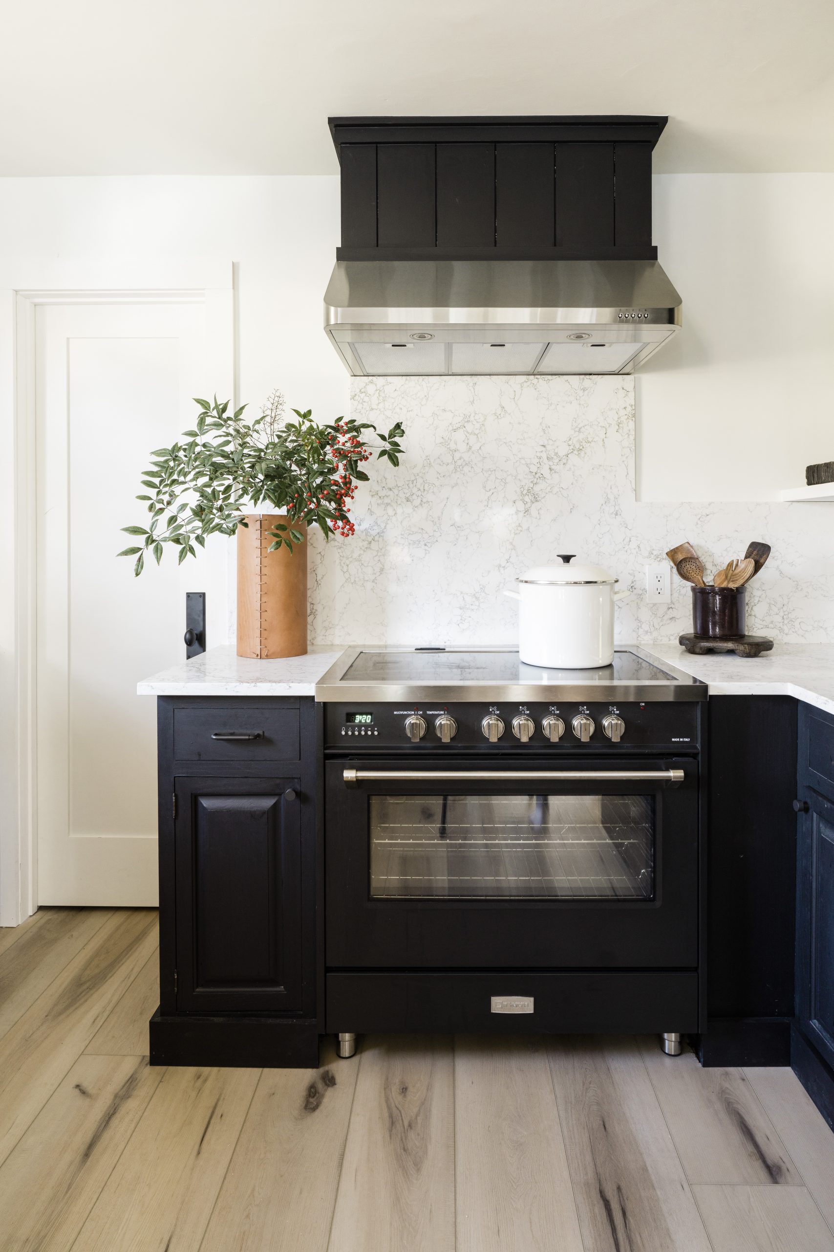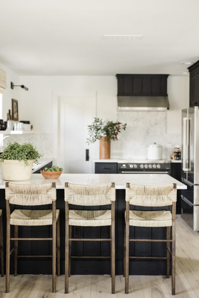 When the cabinetry and range colors were finalized, Anastasia had second thoughts about her plans for a range hood. “I felt like we needed some black up top to balance the space,” she says. She decided on the 36” Low Profile Range Hood that could be mounted under a custom-built header with shiplap trim and then painted the same black shade as the rest of the kitchen cabinetry.