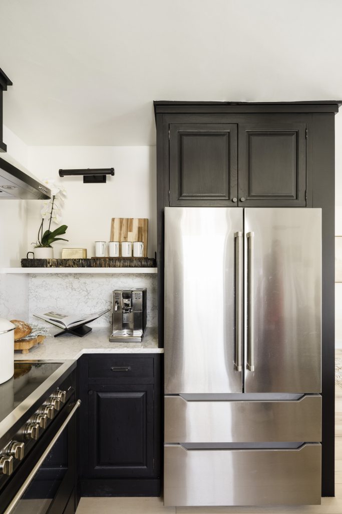 If you’re on vacation at a lake house, you’re likely spending most of your precious hours in the great outdoors or on the go. Anastasia can agree. “We’re constantly coming and going from the lake house,” she says. A large, 36” French Door Refrigerator with clear interior storage bins can easily show you what’s stocked, what needs to be tossed and what can be stowed away in the freezer to avoid food waste. “I love that the doors each have deep compartments, plus it came with a standard freeze drawer AND deep freeze drawer option,” says Anastasia. The counter-depth fridge from Verona was given a built-in look by reusing and refinishing the existing upper cabinet box, adding a faux side panel of pine plywood and trimming everything in to tie it all together.